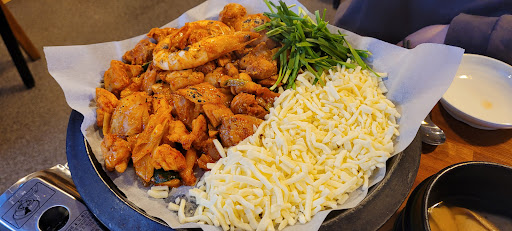 맛있게 잘 먹었습니다. 특징 보통 앉아있던 테이블에 위치한 철판위에 재료 올리고 거기서부터 조리가 시작되는 닭갈비와 다르게 조리된 상태에서 나옵니다. 닭갈비 1인분당 새우가 1마리씩 들어가는데 머리와 꼬리를 제외하곤 껍질이 벗겨진 상태에서 나와 먹기 편합니다. 특이하게 위에 부추? 로 보이는게 올려져 나옵니다. 토치로 불향을 입혔는지 위에 살짝 탄자국이 있습니다. 닭갈비는 순한 보통 매운 맛 3단계라 하시고 보통맛은 신라면 정도라 하시는데 신라면 보다는 많이 덜 맵습니다. 닭갈비 자체는 크게 특징없는 맛이었지만 치즈와 어우러지면서부터 풍부하게 맛있음을 느낄 수 있었습니다. 아쉽게도 사리 부분이 취약했습니다. 모듬사리는 없고 면 사리나 새우사리만 있었던거 같아요. 그리고 기본으로 나오는 사리들 중 감자나 고구마 등은 없어 조금 아쉬웠습니다. 쌈무나 마카로니샐러드? 는 만족스러웠습니다. 김치는 중국산이라 하셔서 손을 안댔고 어묵국은 소주안주로 딱 좋은정도였습니다. 마카로니 샐러드에 양파가 들어간 부분이 특히 만족스러웠습니다. 볶음밥은 2천원으로 밥과 양념과 김가루만 있었던거 같습니다. 종이 호일 위에서 볶았는데 나름 밥알이 심하게 타지 않고 누룽지처럼 바삭하게 된 부분이 만족스러웠습니다. 볶음밥의 맛은 나쁘지 않았지만 가격을 올리거나 볶음밥에 추가 토핑으로 치즈나 날치알 등이 추가됬으면 어떨까 하는 생각이 들었습니다. 볶음밥을 주문하실땐 닭갈비가 5~8조각정도 남았을때 볶아달라 하시는게 좀더 씹는...