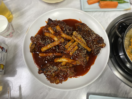 양념 뼈 구이는 돼지 등뼈를 고추장 양념에 버무린 건데 바베큐처럼 은은한 숯불 향이 고기에 배어있다. 제일 작은 사이즈였는데 떡사리도 들어있어 양은 충분했다.