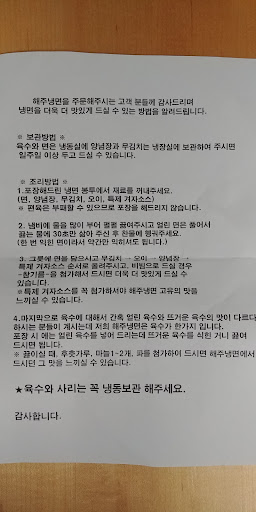 양념은 냉면에 찰싹 들러붙는 타입이어서 젓가락으로 면을 들때 약간 찐득하다고 느껴지는 정도로 어느정도 먹었을때쯤 이마에서 식은땀이 흐르는 걸 느낌. 돼지고기편육은 한방보쌈의 수육같이 계피향같은게 조금 났고 대부분의 냉면 위에 올라가는 편육처럼 촉촉하진 않았지만 그렇다고 뻑뻑하지도 않았음.