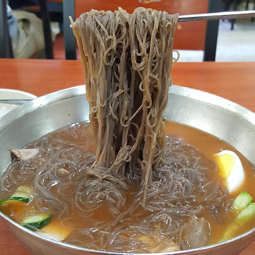 When ordering (냉면) Mul-Negmyun (물냉면): This comes without the spicy sauce but they have jars of it on the table. This allows you to decided how spicy it will be. Bibim-Negmyun (비빔냉면): This will come will a helping spoon full of spicy sauce and less of the cold broth. Also very delicious and a veey popular...