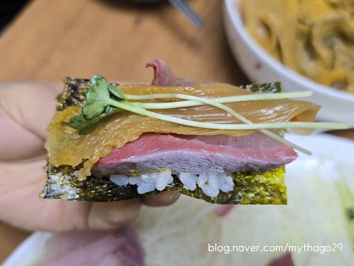 저는 대방어반 모듬반을 4~5인(대대, 160,000)로 주문했어요. 당연한 이야기지만 위에 올려진 부위가 제일 맛있었어요.