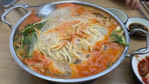 I had the seafood noodle soup. I like how it is prepared here. After ordering, banchan and a pot of broth is brought to the table, where it is heated. Once ready, a plate of fresh noodles and seafood is added to the broth.