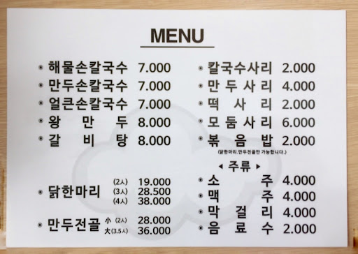 Read more이 식당은 늘 사람이 붐빕니다 주변에 식사 할 만한 곳이 마땅하지 않은 것도 이유가 되지만.. 1인 메뉴가격이 7-8천원대로 저렴한데~ 음식양은 푸짐하고 맛있는 것도 맞습니다 칼국수 나오기 전에 보리밥이 나오고, 본메뉴가 등장합니다 직접 먹어본 해물손칼국수 만두손칼국수..모두 국물이 개운하고 시원해요.. 카운터에 계신 여자분이 계속 만두를 빚으시던데.. 진짜 손만두 왕만두!! 입니다 다음엔 만두전골 도전해야겠어요 (식당내부가 아늑하거나 고급스럽지는...