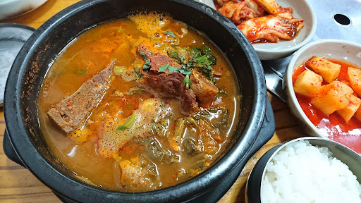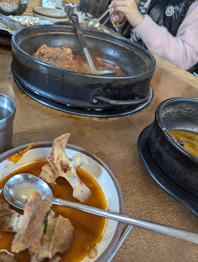 I ordered a medium pot of spicy gamja tang and a medium pot of not spicy gamja tang. A 12 year old loved the broth immediately. Everyone else followed. Food was not enough so we ordered 2 orders of additional bone (=meat), 2 orders of dumplings, 2 orders of greens 시래기, 3 orders of streamed rice, 2 ordered of fried rice, 3 beers, 2 sodas... The total was a little about 105,000 KRW which equates just under 75 USD. We were blown away how cheap yet amazing the taste and experience were.