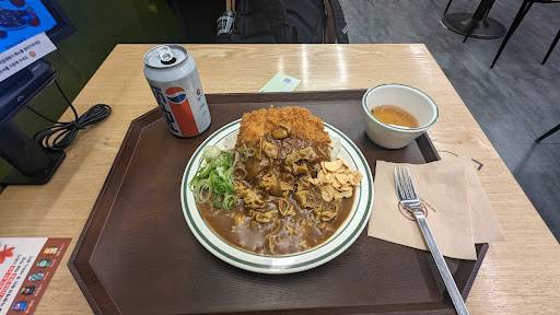Simple curry, simple menu. Order on the touch screen at your table, and they will notify you when your food is ready to be picked up at the counter. Everything is delicious. They have sides also, which you can get yourself. The food is good, and in this area, it's a cheaper option. They serve Pepsi products (no coke). The staff was helpful, and changed my menu to English. The area is clean, and there were other patrons...