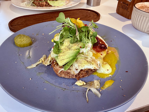 The second dish — brioche and baguette toast with scrambled eggs, avocado, mozzarella, and tomato — felt equally well-balanced. The two sauces were the highlight: the tomato spicy sauce brought a gentle kick, while the mayo-basil sauce added creamy freshness. Combined with the herbs, young greens, and pickles, every bite was vibrant and harmonious.