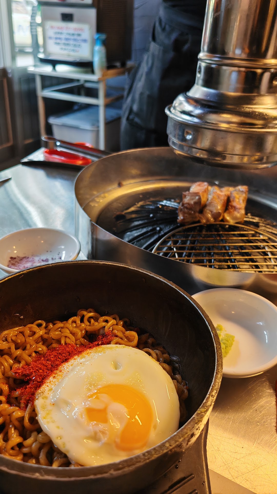 they do require you order a minimum of 2 servings of the meat, so I ordered the pork neck. I also ordered the kimchi noodles, which are cold noodles and were delicious!
