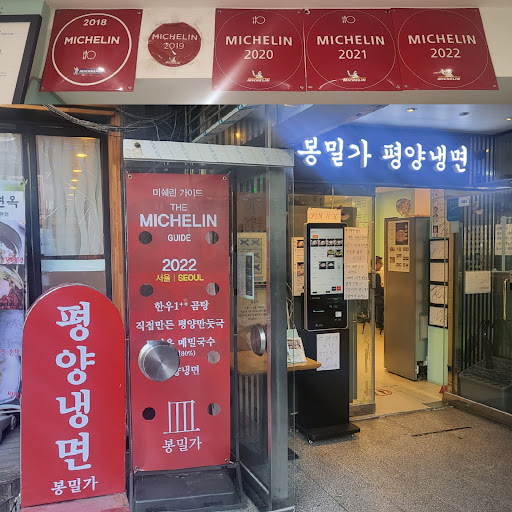 가족인원이 어린가족인원이 좋아하는 BHC 뿌링클 치킨을 사왔는데 먹으면 또 먹긴 하지만 그래도 인위적인 향이 싫어 먹기 싫어서 어떤 냉면집을 가 볼까 하다 집에서 제일 가깝고 평도 괜찮은 것 같고 지난번에 한번 위치나 확인해 보려고 봉밀가가 있다는 건물을 한바퀴를 돌았는데 청담면옥만 보이고 봉밀가는 안 보여서 이 건물이 아닌가 했었는데 나중에 보니 가게가 건물 안쪽에 위치해서 바깥에선 안 보이는 거였음.