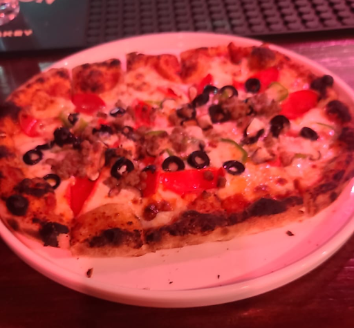 The drink selection is excellent – lots of good bottles on display and the bartenders know their stuff. But the real surprise? The pizza. Wow. I wasn’t expecting a pub to serve such a solid pie, but this one seriously delivered! Perfectly cooked crust with that slight char, gooey cheese, and toppings that were fresh and flavorful. The one I had came loaded with olives, peppers, mushrooms and beef. Super satisfying.