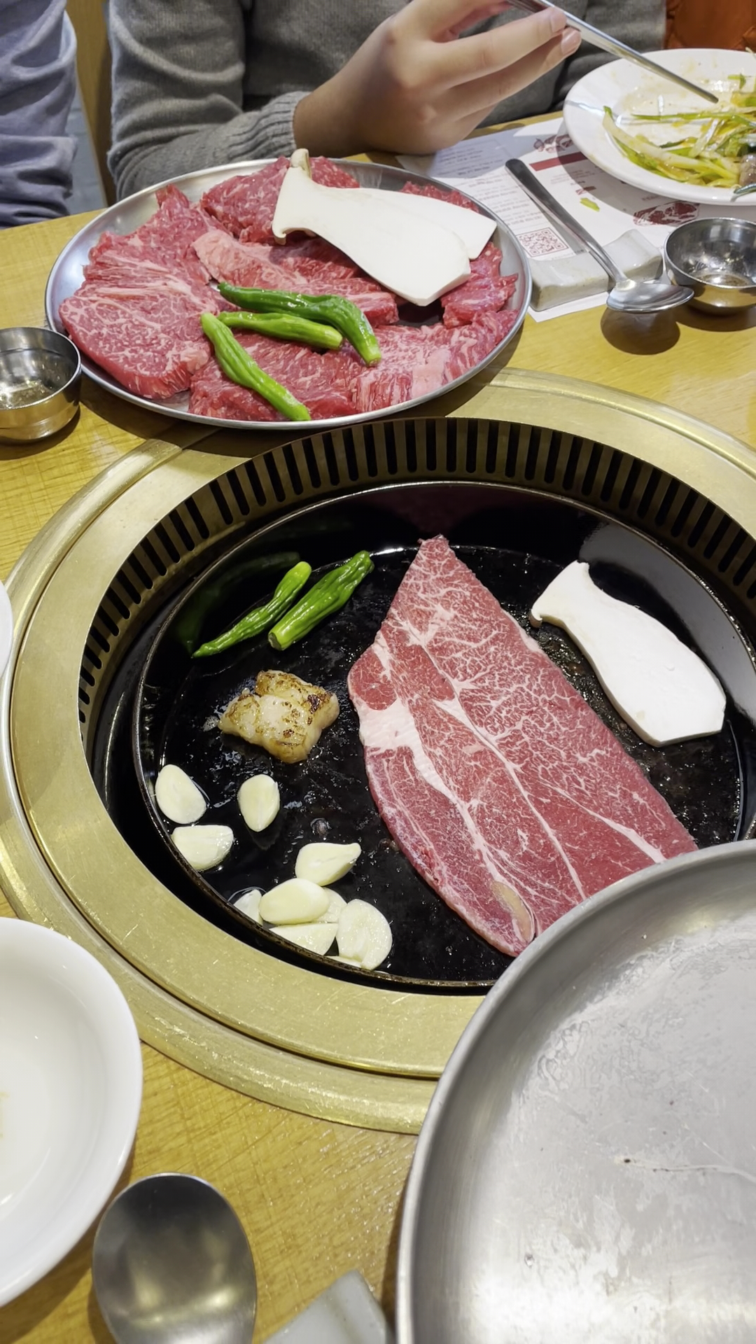 For the 4 out us we ordered 2 portions of the 170g Sirloin and 1 portion of the 120g ribeye slices. It was more than enough. As usual for any Korean batbeque there were the side dishes that came with the beef - the kimchi and vegetables. They also served a plate of seasoned spicy green onion (called Pajeori…?) which became a bed for you to lay the beef off the grill. You’d wrap these around each beef cube and pop it in your mouth.