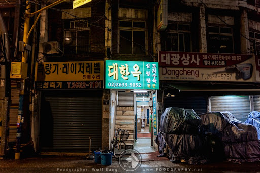 건설, 기계공구, 측량기, 유압기 등의 단어가 적힌 불 꺼진 간판들 사이로 대한옥의 푸른색 간판이 홀로 불을 밝히고 있다. 적막한 바깥 분위기와 다르게 식당 안에는 사람들이 가득했다. 기계, 공구로 가득한 차가운 동네에 온기가 느껴지는 작은 점. 시작은 주변 상인들을 상대로 한 설렁탕과 안주를 파는 식당이었겠지. 1970년에 문을 열었다는 이 집은 이제 레트로 바람을 타고 '힙' 하다는 유명 노포 중 하나가 됐다. 2, 3차를 갈 수 있게 주변 상권이 형성되어 있지 않은 외진 곳이지만 손님들의 얼굴은 대부분 20~30대로 보였다. 공구 상가 사이에 홀로 자리 잡은 오래된 식당이라는 것이 더 매력적인 것 같다. 젊은 연인에서 수십 년 이 집을 드나들었을 아저씨들까지, 휴일의 저녁을...