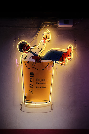 A very nice craft beer place in the heart of Euljiro. Itโs situated in a characteristic Seoul alleyway with neon signs surrounding it.