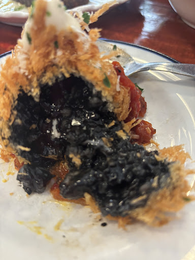 I ordered the Sicilian arancini—not gonna lie, I had no idea what it actually was at first. It looked like a giant, golden-fried meatball sitting in a pool of bright red sauce. But the moment I cut into it… surprise! It was stuffed with jet-black squid ink risotto. Super filling, with gooey, melty cheese and little bits of tender, springy squid inside (or maybe cuttlefish? I honestly couldn’t tell, but it was delicious either way). Totally the kind of bold, satisfying brunch dish that powers you through a lazy...
