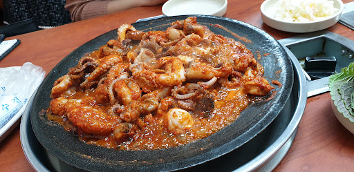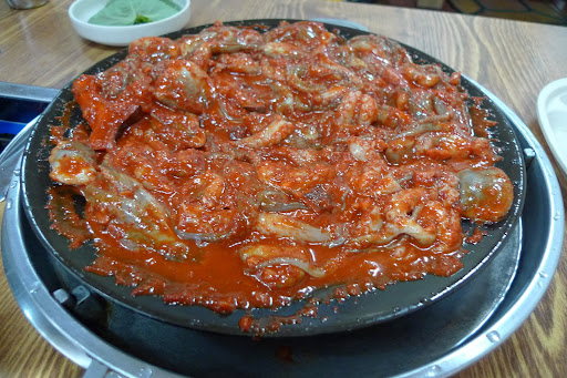 This restaurant took us on a trip today. Opened the door, held up 4 fingers for a table, was sat in the cnr and food was brought out. There is no ordering here. You get the portion size for the number of people. For us it was 2 bowls of marinated baby octopus. Immediately the first bowl was poured onto the hot plate and mix of steam and chilli filled the air.