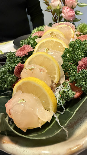 Next, we were introduced to lobster sashimi—a first for me. Served with a delicate touch of gold flake, the sashimi was incredibly fresh and sweet. It was accompanied by a variety of fresh seafood on the side.