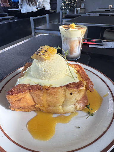 I came here with my friend who loves corn and our taste buds were in heaven. The corn latte and the corn French toast is a must try! It was a unique twist on a classic, with a subtly sweet and savory delightful texture. Each bite was perfectly crispy on the outside, yet soft and fluffy on the inside, with a comforting hint of ice cream to balance the warm toast. The juxtaposition of temperatures between the ice cream and the toast is quite the experience. Topped with a touch of butter and syrup, it was absolutely delicious and unlike anything I've ever tried before. Highly recommend giving it a try if you're looking for something new and flavorful! In addition the owner who is very sweet explained to us that her inspo for the interior design of this cafe was from the highline in New York. My friend and I are both from New York and we thought it was very cute. Very spacious, sleek minimal design with cute flower arrangements allows for maxed out vibes. Will be back to get the latte and French toast...