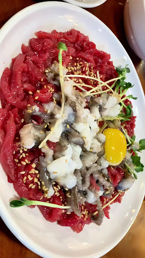 人気メニューは、生レバー、新鮮なユッケやユッケタンタン(ユッケと生きたテナガダコの刺身)、ピビンパ、肉刺しなど。 他では見ないユッケジャンも良い!