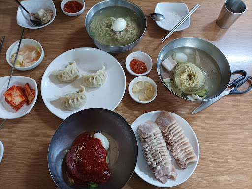 ย ย ย Read moreFood definitely on the pricier side, but it was to be expected in Seoulโs Gangnam district. Furthermore portions were quite generous so value wasnโt too bad. Waitresses know their stuff and recommended the mul-naengmyeon (๋ฌผ๋๋ฉด) as well as pork pyeonyuk (ํธ์ก). On the other hand the bibim naengmyeon (๋น๋น๋๋ฉด) and dumplings/mandu (๋ง๋) we decided on for ourselves werenโt the best (since we had better bibim naengmyeon and mandu at a fraction of the price at other places), the mul naengmyeon with extra vinegar and mustard over top, and pyeonyuk were very good - especially the pyeonyuk which absolutely melted in our mouth.
