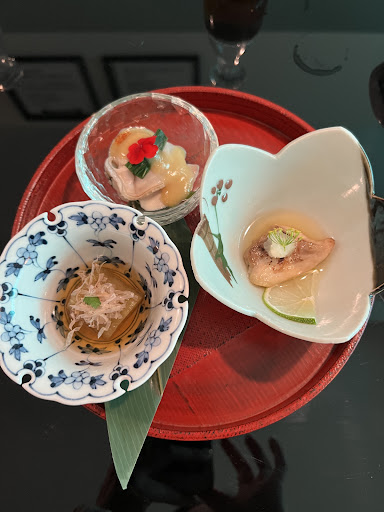 The good: excellent, attentive service— our tea cups were never empty. The private room felt special, and the art was quirky and added to the unique atmosphere. Portion sizes were generous: We didn’t finish several of the later courses and still left feeling full. Finally, the first couple of dishes were lovely: cold abalone salad, sashimi, and a mixed set with some vegetables, a bite of taro, a square of pistachio cream, and some octopus
