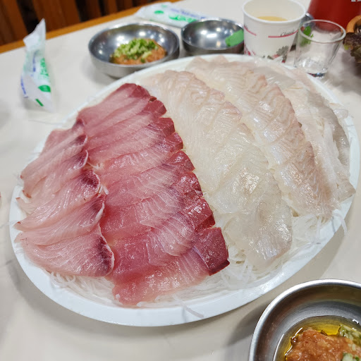 On oublie l'anglais, ici รงa se passe en corรฉen. Mais les dames lร ont รฉtรฉ trรจs serviables, nous ont montrรฉ un menu. Puis on a pris une chance sur "modeun", un mix de sashimi blanc (mets typiquement corรฉen), de la pieuvre รฉpicรฉe, des patates en kimchis. Dรฉlicieux.