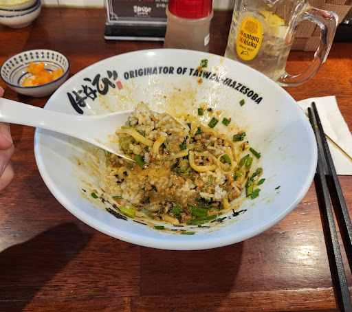 Mazesoba means, mixed noodles, such as the Ramen without soup in Taiwanese style. It was developed in year 2008 and now very popular in Japan, even though many others try to imitate the taste. The noodles are chewy and the sauce is delectable with the harmony of many ingredients - soft boiled egg, spicy minced pork, chashu as well as green onion and seaweed. After eating one third of noodles, adding kelp vinegar on noodles is recommendable which presents different flavors of this cuisine. The delicacy of Mazesoba is to mix rice with the leftover sauce. (The rice is provided free of charge)