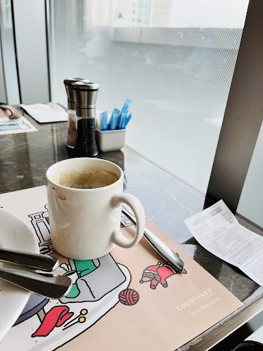 2인 42,000이었던 같은 코트야드체인의 판교점이 최저가였는데, 코트야드타임스퀘어점은 1인 25,000에 이용이 가능했으므로 1인이용하는 저로서는 최저가는 이곳인 셈입니다. 높이가 높지 않는 5F이었지만 창가석은 양쪽으로 있었고 안쪽은 영등포소방서뷰가 그리고 자리안내를 받은 가든뷰는 신세계와 씨지비를 연결해주는 옥상정원이 보입니다.