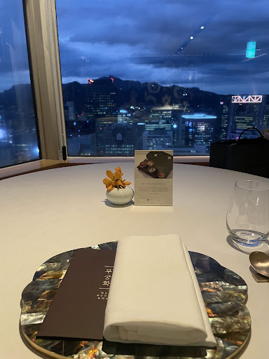 런치 소백코스 주문했습니다. 약간 옛스러운 예식장 뷔페같은 인테리어에 다닥다닥 붙어있는 금융회사건물들이 보이는 뷰였어요. 첫번째요리로 주전부리가 나왔습니다. 주전부리가 제일 맛있었어요. 팥과 생강,잣을 갈아넣은 잣향가득한 꾸덕한주스와 적절한 씹는맛과 쉽게 바스라지는 쌀로만든 전병들 맛은 가볍지 않고 재료의 깊은 맛이 입안에 멤돌았어요. 두번째요리로 우엉강정,방어회가 나왔습니다. 우엉강정은 단단해보였는데 의외로 따뜻하고 부드러웠어요 당근잎을 갈아만든 소스와 정말 잘어울렸습니다. 방어회는 다시마잎에 감싸 숙성시킨후 김에 말았다하셨는데 음식에서 쉰내나서 먹기 거북했습니다. 세번째요리는 진구절이 나왔습니다. 생 만두피에 야채반찬을 올려서 겨자에 찍어먹는맛이었어요. 시원한 야채만두맛이었습니다 네번째요리는 새우 만두가 나왔습니다. 염분기빠진 탱글한새우만두맛이었어요 국물은 염분기 가득한 새우육수국물이었어요. 그냥그랬습니다 다섯번째요리는 전복구이가 나왔습니다. 퓨레와잣을 이용한 퓨레에 전복구워 올리고 목이버섯과 동충하초로 장식했다하셨습니다. 동충하초는 처음 먹어보는데 생긴건 버섯같이생기고 식감도 버섯이라 어떤거였는지 잘모르겠더라구요. 참 쫄깃했습니다. 그냥 버섯 볶음맛 천천히 식사하고싶은데 숫가락 내려놓자마자 남자서버분 바로오셔서 그릇 치워주시고 여자서버분 그다음 요리바로가져다 주심과동시에 들을 준비가됐던말건 음식설명 뚝딱하고 가버리십니다. 참 급해서 아쉬웠어요 룸도 있던데 단체손님들도 같은 홀에 꾸득꾸득 넣어서 정말 시끄러웠습니다. 알고싶지 않은 개인 사적인 이야기,사업이야기,드라마이야기등등 소리가울리면서 듣고싶지 않아도 들어야하는 불편함이 있었어요 여섯번째 요리는 해삼증이 나왔습니다. 처음 맛보는 맛이었어요. 탱글탱글한 해삼 속에 전복을 비롯해 다양한 재료로 속이 채워져있었고 국물은 약간짯고 위에 고명으로올라간 인삼덕분인지 한약 냄새가 풀풀풍기는게 좋았습니다 일곱번째로 한우안심구이가 나왔습니다. 식사할때 제뒷쪽 옆선반에 미리 가져다놓으셨어요. 약간 식었습니다. 정말 짜증나네요 너무 급합니다. 장아찌 달달해서입가심하기 좋았구요 고기는 부드럽고 달콤한양념이 맛있었습니다 여덟번째 식사요리는 굴 꼬막 비빔밥 선택했습니다. 식사요리는 다른요리에 비해 시간이 걸렸네요 적당한 굴에 야채비빔밥이었어요. 좋았던점은 김튀김이 있어서 크런치한식감이 재밌었어요. 국물은 조미료안들어간 깔끔한 국물이었어요. 김치대신 달달하고 아삭한 매실장아찌가 비빔밥과 잘어울렸어요 아홉번째 요리는 디저트였고열번째는 다과와 차인데 한번에 싹 나왔습니다. 뭐가이리 급했던걸까요 코스데로 차근차근 음식나오는게 기본아닌가요? 디저트에 두부아이스크림이 있었는데 녹아있었습니다. 구수한 아이스크림이었어요 한과는 솜사탕마냥 입안에 넣자마자 사르르 녹아내리고 이북식 인절미는 쫄깃쫄깃 찹쌀떡같은데 인절미 맛도 나서 좋았어요 샤인머스켓과 딸기도 나왔는데 딸기는 너무셨습니다 당도는 전혀없고 시기만했어요 다과에 양갱은 달고나맛나면서 맛있었고 차역시 구수했습니다. 만족하기어려운 식사였고...