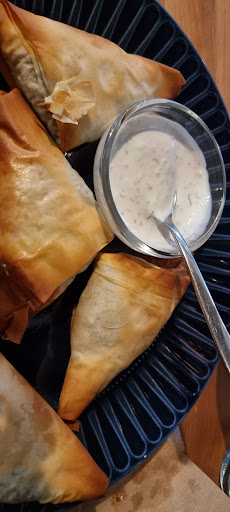 레몬 닭고기 구이를 미리 요청드렸는데, 주문이 누락되어 먹어보지 못했다. 그 외에도 다음날 휴무여서 그런지 궁금했던 티로피타키아, 치즈케이크 등의 메뉴들 이 품절 상태였던 점도 아쉽다. 그래도 다른 색다른 메뉴들도 많아서 선택의 폭이 크게 제한되지는 않았다. ♤ 스파나코피타키아 (19,000₩) 가장 호평이 많았던 메뉴라서 망설임 없이 주문. 필로 페이스트리지로 만든 그리스식 파이로, 시금치와 페타치즈를 넣은 춘권 정도의 느낌이다. 굉장히 담백하고 기름기 없다. 안에 시금치와 치즈가 밀도있게 들어차 있다. 기대보다는 무난했다.