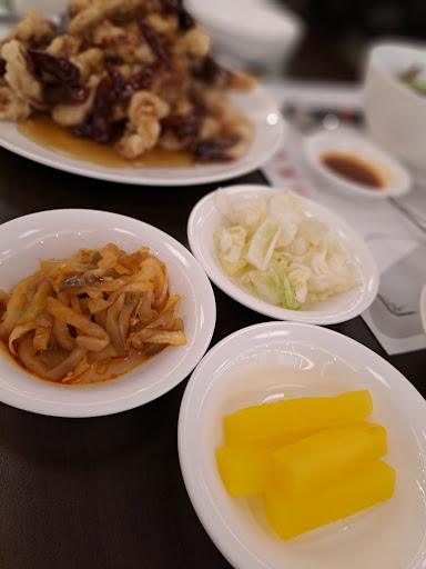 This Chinese restaurant serves a good variety of Chinese cuisine. Besides the usual jjajangmyeon, jjamppong and tangsuyuk that many Koreans are familiar with, there were many other Chinese dishes. As this was our first visit, we only ordered a small serving of spicy tangsuyuk (₩28,000), jjajangmyeon (₩10,000) and spicy jjamppong in clear soup (₩12,000). The spicy tangsuyuk differs from traditional tangsuyuk in that they replaced the purple cabbage and pineapple pieces present in the traditional version with fried dried chillies in order to make it spicy. Honestly though, unless you eat these dried chillies, the tangsuyuk itself is not spicy at all, so these chillies failed to achive their purpose. These dried chillies are also so spicy that it is almost impossible to eat them unless you have very high spice tolerance. I ate quite a few pieces of the chillies and my stomach was burning from the middle of the lunch onwards. I would recommend ordering the traditional tangsuyuk instead of the spicy one. The tangsuyuk served was at room temperature. My guess is that the tangsuyuk was pre-fried and then left on the side. While the tangsuyuk was crispy, the pork was a little dry and not flavorful. The jjajangmyeon was similar to many other jjajangmyeon except that it had shrimp as well. The jjajangmyeon sauce was not very abundant though, being just barely enough for the amount of noodles given. The spicy jjamppong in clear soup was not spicy at all as the chilli oil & chilli flakes used in the usual jjamppong were replaced with dried chillies (like in the spicy tangsuyuk). So, unless you eat the dried chillies, it was more like a bowl of seafood noodles with clear soup. The serving size was generous with a lot of noodles, squid and shrimp. The jjamppong soup was not abundant though, rather like the jjajangmyeon sauce. Somehow, none of the food was piping hot when it was served; it was just slightly warm. It did not feel like the food had been cooked to order; rather, it felt like everything was pre-prep. That also explains why the food was served very quickly after I placed my order. The side dishes comprise pickled yellow radish, pickled white cabbage and Szechuan-style ickled vegetables. Just the typical and average side dishes. Compared to many Chinese restaurants, this is definitely one of the better ones. The interior is simple and clean with ample space between tables. The place is ideal both for meals with family and friends, and for business associates. Overall, except for the temperature of rhe food, the taste and quality was good. I will revisit if I am craving in the vicinity and am craving Chinese cuisine. Lastly, the bathroom was horrendous so just try not to use it if you can....