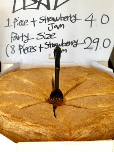 The red plastic stools and tables wrapped with Onion tape create a bold visual identity, casual yet memorable. The air is filled with the buttery scent of freshly baked Pastry Pizza Pie, crisp outside and soft inside, paired with handmade strawberry jam — simple but perfect.