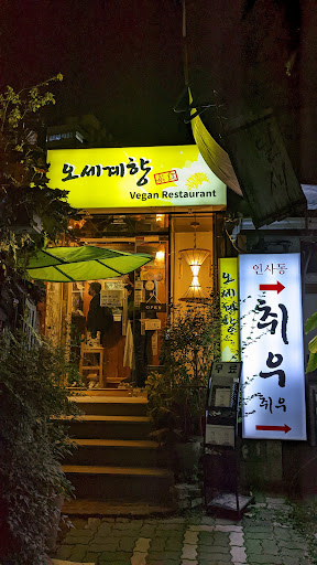 Tucked away in a quiet alley, Osegye Hyang 오세계향 is a vegan restaurant that offers a delightful array of plant-based dishes. This hidden gem provides a haven for vegans and non-vegans alike, with a diverse menu offering numerous flavorful options. The dining area is reminiscent of an old traditional Korean home.