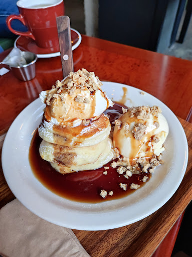 It's so sad to have such an amazing vibe of a place but then the food fell on the disappointing end. There weren't much customers as i came on a weekday afternoon. There were only me and another guest who both came to eat alone. The pancakes took made time toe prepare sicne there's only 1 staff. The cafe latte was decent, could be better tho. I had the chocolate pancake and it came out with lots of topping and pipping hot (yay). But the batter of the pancakes for me was unforgivable. It was dry, only the lumpy side and i could tell there was too much flour in it. There was holes in the pancakes which told me that the batter was either old or wasn't cooked properly. But their vanilla ice cream was fresh and if good texture. The granola they chose to use for topping was not good either. But their pancakes are on the cheaper ends, i personally recommend to pay a bit more for some soufle pancakes to avoid...