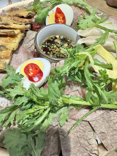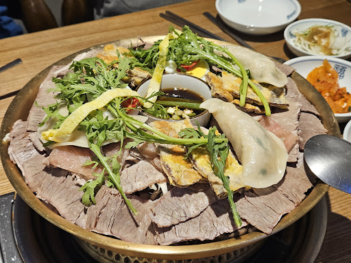 A place to enjoy Eobokjaengban and Pyongyang-style naengmyeon. While the prices are on the higher side, the service is friendly and the portions are generous. The side dishes are well-prepared, and there's no sense of anything lacking. Additional broth for the Eobokjaengban or extra side dishes can be requested without hesitation. The broth for the naengmyeon is slightly seasoned compared to the typically mild Pyongyang-style, so it feels less bland. The Eobokjaengban, which includes jeon and dumplings, makes for a hearty and satisfying meal. Parking is available behind the restaurant, and even on rainy days, you can make your way through the alley without...