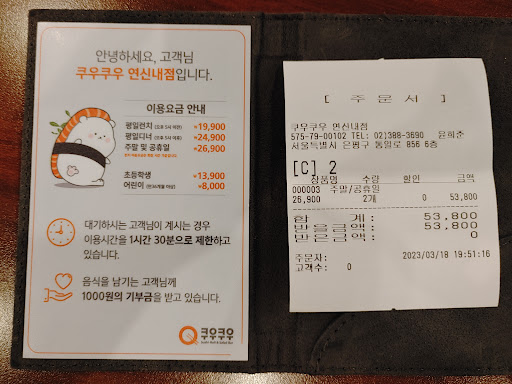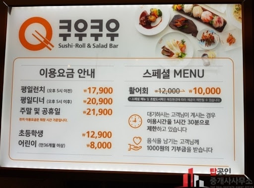 The best QooQoo in Korea? Maybe. If you cannot decide what you want to eat, it's the best value option in the area. It's an amazing place to ruin children. FOOD - good quality and variety for a mid-tier buffet, including sushi and made-to-order soups/noodles. Extensive sweets array with 3 types of slushies, chocolate fondue fountain, bingsu, soft serve ice cream, cookies, cakes, fresh fruit, candy... so many ingredients to create insane concoctions. SERVICE - the place is clean, which is amazing considering the amount of foot traffic and kids. The workers dash around silently, perfect for a buffet. PLAYGROUND - a sneaky big and colorful place to leave kids if you are not super concerned about communicable diseases. It is the best QooQoo I have been to, and one of the best places to stuff yourself for not...