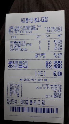 Read moreSaemaeulsikdang is open 24/7! So if your looking for a place to eat in the morning, this is the place to go. The menu isn’t huge since it is a bbq restaurant but does have some dishes to choose from also! Food came out fast, thou thou the 7 minute pork kimchi stew came out a little later, (probably around 7 minutes or so)ㅋㅋㅋㅋ! The meat was great, no smoke issues at all, the kimchi stew came hot and very tasty, like the menu says “recommended” I would agree! Along the wall are autographs of famous people who has visited the place and I sat right in front of Crown J, how awesome is that! Located in a great location, easy to get to by subway and right down the street from Hongdae...