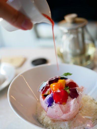 Read moreThe Champagne Ball was one of the best desserts I've ever had in my life. The balance of the dessert was biblical: the champagne foam deliciously melted in your mouth, the fruits provided a deep, natural flavour to ground you, the flowers were beautiful visually but subtle in the texture and accents they provided, the cheese cake snow tied it all together beautifully with its tartness but never overwhelming, and lastly, the sugar shell for extra texture and oomph. What a delicate, but beautiful dance. Every bite was...