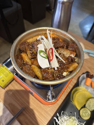 *Creamy Galbi-jjim (braised short ribs) 크림 소 갈비찜 The pot was LOADED with big chunks of braised short ribs. The ribs were tender and well-marinated. We added glass noodles for free and it absorbed the creamy spicy sauce. Def a must order add-on. The tteokbokki was flavorful and perfectly chewy. They offer unlimited refills for noodles...