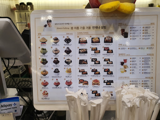 Read moreTables are not cleaned adequately for next customer. Staff are mostly busy with counter orders. Sulbing cafe has a variety of shaved ice with real fruits. Self order at kiosk (with English language option). Ordered their new item. The Half melon fruit (you don't get the entire whole melon fruit) color looks dull as if being cut and left out in fridge for some time. Strawberry (real fruits) inside the melon are little and not sweet at all. Not generous with fruits, but generous with shaved ice. 16600 won. If you like pat-bing su and have a sweeth...