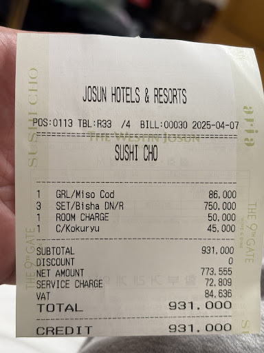 The cod was very good as it should be considering that it is triple the price compared to non 5-star hotel restaurants. The set was about double the price but my friends assured me that it was the best sushi they ever had. We paid an extra KRW50,000 for a private room. The cool thing was that all prices are inclusive of service charges and VAT, which can add 21% to the bill.