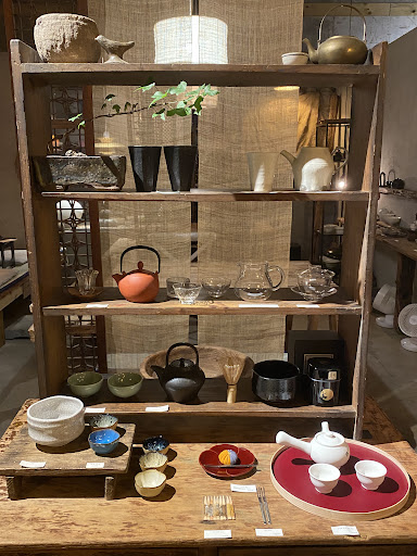 They've got a boiling kettle of water in the middle that you delightfully can use a bamboo scoop to refill your pot of tea with, and lots of beautifully displayed ceramic cups and bowls that you can buy.