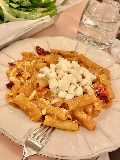 The fresh mozzarella on top of the vodka rigatoni pasta is hardened when the dish is served, but melts quickly because of the hot rigatoni noodles.