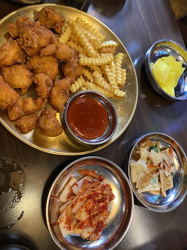 We also ordered the fried chicken with crinkle-cut fries, and it was crispy and juicy â perfectly paired with the sweet and spicy dipping sauce. The side dishes were a great touch too, especially the kimchi and fish cake stir-fry, which added a nice variety of textures and flavors.