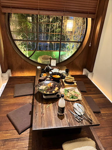 The seating area was a cozy, traditional Korean setup with a low table and floor cushions, placed by a large window overlooking the outside —calm, scenic, and perfect for relaxing.