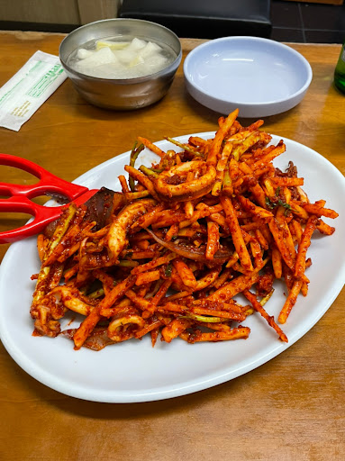 Read more오징어볶음과 오징어무침을 주메뉴로 팔고 있는 영등포역 근처에서 오래된 맛집이에요. 본관과 별관이 바로 맞은 편에 위치하고 있어요. 거의 이년만에 방문해서 오징어볶음과 여러가지 음식을 시켰어요. 오징어볶음은 미나리와 무 등의 야채와 오징어를 매운 소스에 볶아내서 불닭볶음면 정도의 맵기에요. 질긴 것은 별로 안 좋아하는데 여기는 오징어가 질기지않은 편이라 한번씩 생각나요. 개인적으로 상추쌈에 밥과 오징어볶음 콩나물을 넣어서 먹으면 맛도 식감도 좋더라구요. 오징어순대는 오징어 안에 찹쌀을 넣으신건지 엄청 쫀득에요. 오징어 집을 한 수제 동그랑땡이라고 생각하시면 될 것 같아요. 맛있어서 두 접시 시켜먹었어요. 해물파전은 그냥 보통의 맛입니다. 중간중간 칵테일새우와 오징어가 들어간 파전이에요. 계란찜은 크기와 가격대에 비해 비싸고 별로에요. 대접밥은 김과 따뜻한 밥 밖에 없긴하지만 오징어볶음/무침과 상추에 싸먹을 때 필수에요. 오징어볶음이나 무침과 오징어순대는 추천드릴게요. 볶음은 조금 매운 맛이 올라오고 무침은 초장의 새콤한 맛이라 기호에 따라 고르시면 될 것 같아요. 세명이서 술은 소주 4병 먹었는데 10만원정도 나왔네요. 가격대가 양과 퀄리티에 비해 비싼 편입니다. 그리고 사람이 많고 직원분들도 정신이 없는 분위기에 일을 하시다보니...