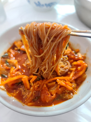 If you are in the Southwestern area of Namhae I definitely recommend stopping by here for a refreshing seafood dish, it's especially wonderful right now during these hot summer days! I actually only found this place because a local cafe owner invited me to lunch with his family, otherwise there is no way I would have found it! It's off the beaten path, with a beautiful view of the harbor and the ocean, little blue boats bobbing around right outside the door. There's not better promise of fresh fish than the fisherman literally walking off their boat next to the restaurant! This is a floor seating only restaurant, and their lunch breaktime is 2-3. It was so popular that we arrived at 3 and they already had a line of people out the door! They take your temperature before letting you inside as well. Once you sit down there's only one dish you can order, the mulhoi! It will come in a large bowl in the middle and everyone will have their own personal bowls. You can add noodles to your bowl then pour the mulhoi over the noodles. It is a raw fish 'soup' of sorts. That doesn't sound appetizing but it is honestly soooo refreshing! It is raw fish, cucumber, pear, and a red sauce that I would not describe as spicy or sweet but somewhere...