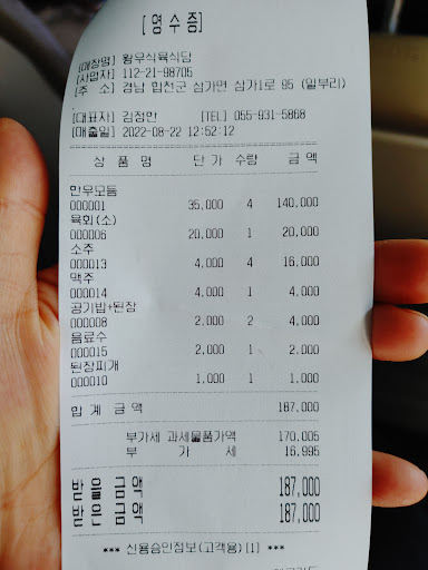 정확한 시간은 기억이 안나지만 세 명이서 10시 30분~11시 사이에 식당에 들어갔습니다. 계산서 첨부합니다. 12시 30분 쯤 되니까... 고마묵었으면 나가야 되느거 아니냐며 사장님이 노골적으로 말씀하시더라구요. 당시 추가로 시켜논 된장찌개랑 소주 한병이 나온지 얼마 안된 시간이라 많이 남아 있었기 때문에 쪼금 당황스럽더라구요. 그 땐 막상 우리가 잘못한 듯하여 얼른 먹고 자리정돈 하고 나왔는데 계산하면서.. 우리가 뭐 잘못한것도 아닌데 말씀이 지나치신거 아니냐 했더니 '여긴 시내 도시 같은데가 아니라서 한 시간만 먹고 일어나야 되는 곳'이라고 친절히 설명해 주시네요. 그래서 아! 허고 나왔습니다! 경영철학을 존중해야지요.ㅜ
