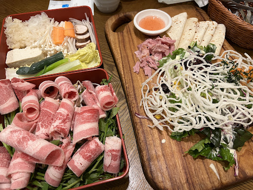 메뉴는 샐러드-샤브샤브-명태튀김-떡갈비(+보쌈)-밥-후식의 순서대로 나오며, 계절에 따라서 세부메뉴가 조금씩 변경되는 편입니다.