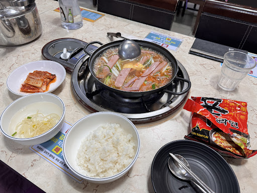 Read more송탄식은 아님. 신김치를 써서 부대찌게 국물이 좀 시원했는데 호불호가 갈릴듯한 맛이였음. 햄이 가장 큰 문제, 육류함량이 적은 햄인지, 아님 가공을 너무 심하게 했는지 부대찌개 특유의 맛이 덜남, 햄의 종류도 매우 적고 양도 적음. 요즘 사람들이나 아이들 입맛에 맞춘듯.. 단백한 맛을 육수로 커버하지만 부대찌게 매니아를 잡기엔 무리가 있는 맛. 애들이 있는 가족끼리 무난하게...