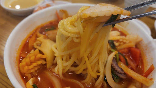 맛은 양파 실짝 익어서 살아있네 단맛 올라오고 국물은 오 안짜...안매워.. 매콤장이 잘 어울리네요 오징어 수입산이겠죠. 질겨요. 홍합은 아주 조금 있고 면은 기계면이고 잘 삶아져 있고 탱글합니다. (수타는 아에요 팍팍 뭉글어지는게 좋은데 양념도 잘 베고) MSG 많이 들어간듯.. 그러나 나쁘지 않네요