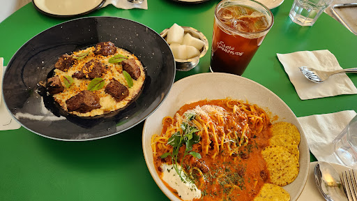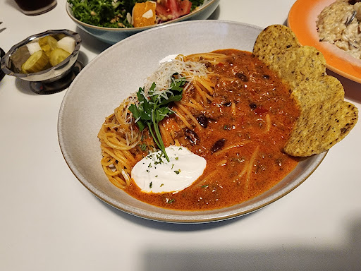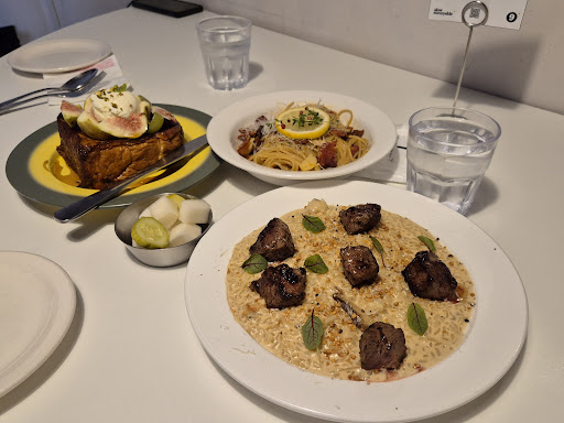 The clam chowder was full of potatoes and actual clams - the sourdough bread was a great pairing. The beef chili pasta was absolutely addictive - the flavor was so full and the spice perfectly sucks you back in to take another bite. The honey egg bread doesn’t seem to make sense on paper but in a bite, a great blend of salty and sweet. We were more than full but still wanting to try all the rest of their dishes. Very much...